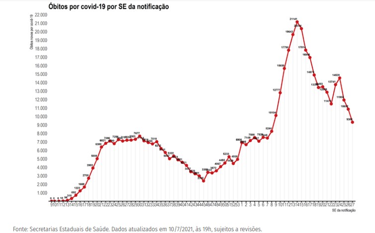 Na Semana Epidemiológica 27 (SE 27), autoridades de saúde registraram 9.306 pessoas que não resistiram à covid-19, enquanto o boletim epidemiológico do Ministério da Saúde na semana anterior trouxe 10.852 óbitos.