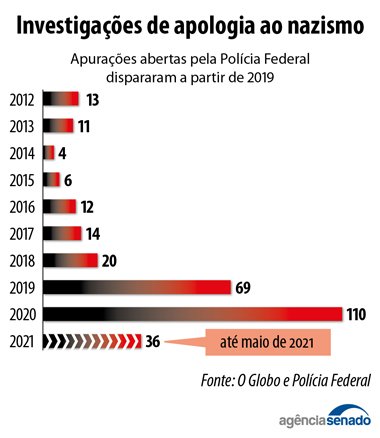 Levando em conta as 36 ocorrências investigadas pela PF nos cinco primeiros meses de 2021, é possível esperar que este ano mantenha a tendência de alta dos dois anteriores. Na semana passada, a Polícia Federal prendeu em São José do Rio Preto (SP) um jovem de 21 anos que fazia na internet publicações discriminatórias contra judeus, católicos, nordestinos, negros e gays. Na casa dele, foram apreendidos desenhos e fotos de Hitler.
