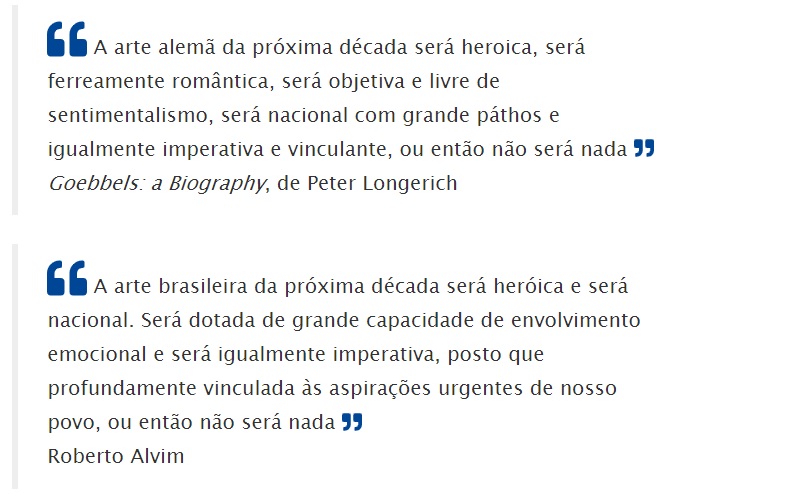 A silenciosa manifestação do assessor palaciano foi precedida, em janeiro de 2020, por um ato espetaculoso do então secretário nacional da Cultura, Roberto Alvim. Ele gravou e divulgou um vídeo em que copiou falas do ministro nazista Joseph Goebbels e utilizou como trilha sonora uma das músicas favoritas de Hitler. Após protestos da sociedade e do meio político, Alvim foi demitido.
