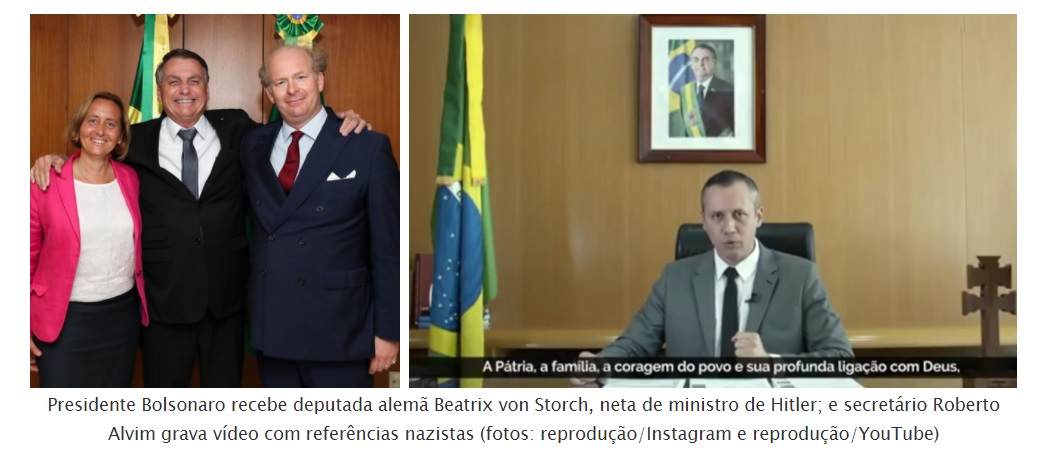 Os sinais desse ambiente favorável a demonstrações de simpatia por ideologias de extrema-direita apareceram em diferentes momentos ao longo dos dois últimos anos e meio. No mais recente, em julho, o presidente Bolsonaro recebeu no Palácio do Planalto, fora da agenda oficial, a deputada alemã Beatrix von Storch, neta de um ministro de Hitler, com quem se deixou fotografar. A foto foi divulgada nas redes sociais da deputada.