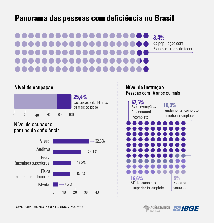 A inclusão no mercado de trabalho também é diferente para pessoas com deficiência. Apenas uma a cada quatro pessoas dessa população em idade de trabalhar (25,4%) estava ocupada em 2019. O nível de ocupação da população em geral era, à época, de 57,0% e, entre as pessoas sem deficiência, 60,4%.