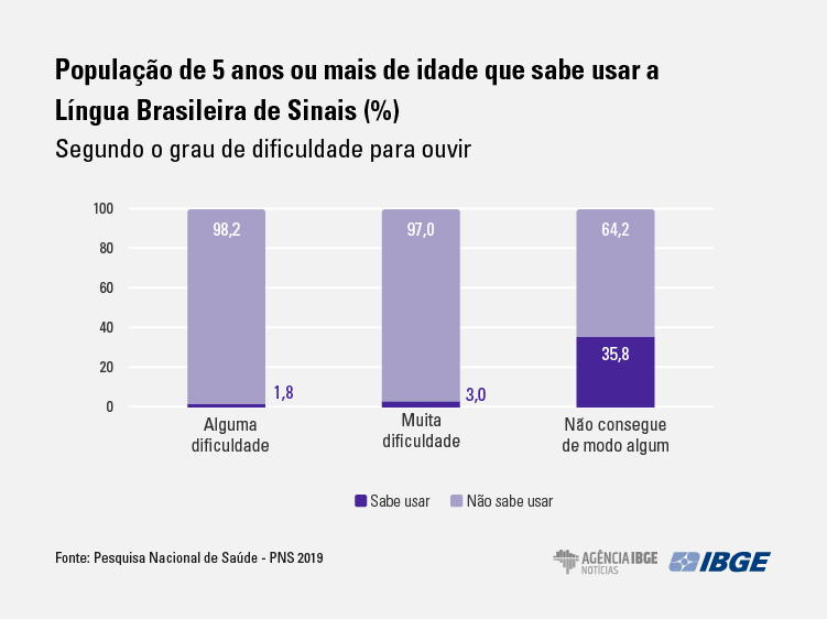Do total de pessoas com mais de cinco anos que não conseguiam ouvir de modo algum, 35,8% sabiam se comunicar em Libras. Já entre aqueles que tinham muita dificuldade para ouvir, o percentual foi de 3,0%.