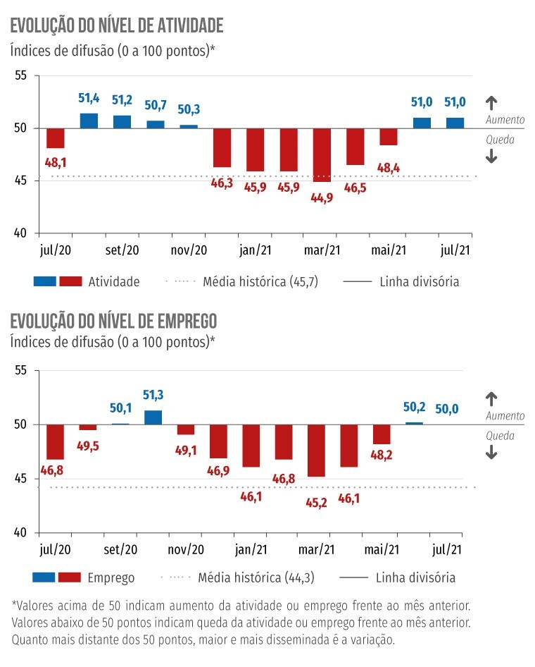 Pelo segundo mês consecutivo, após um primeiro semestre marcado por recuos, o desempenho da Indústria da Construção foi positivo, com 51 pontos numa escala de 0 a 100. Ou seja, a atividade ficou um ponto acima da linha de corte (50 pontos), o que indica crescimento na comparação com o mês anterior. O nível de emprego ficou em 50 pontos, caracterizando estabilidade em relação a junho.
