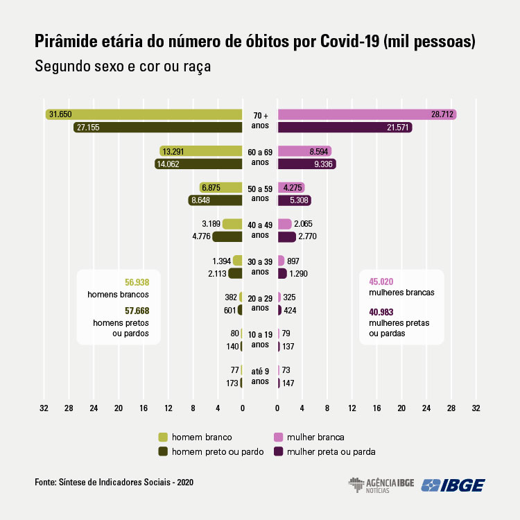 A Covid-19 foi a causa da morte notificada de 209,7 mil pessoas no país, em 2020, sendo 200,6 mortes registradas com cor ou raça. Desse total, foram identificadas 101,9 mil pessoas brancas e 98,7 mil, pretas ou pardas. No entanto, homens pretos e pardos morreram mais da doença, no primeiro ano da pandemia, do que homens brancos. Já entre as mulheres, houve um maior número de vítimas brancas.