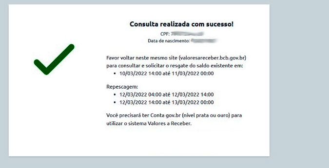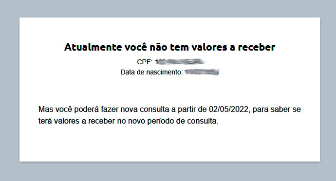 Caso tenha valores a receber, o usuário será informado sobre a data e o período para consultar e solicitar o resgate do saldo existente.