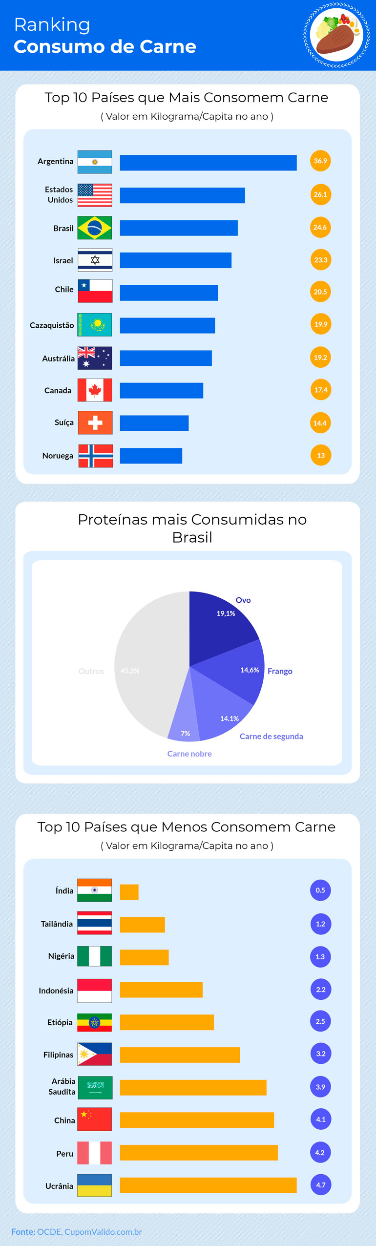 É que revela um estudo realizado pela plataforma CupomValido.com.br com a OCDE sobre o consumo de carne nos principais países.