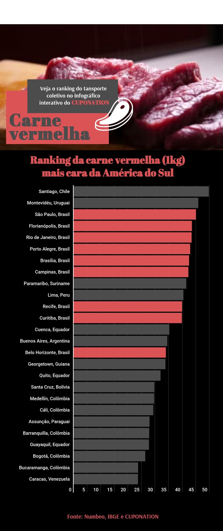 Santiago, no Chile, e Montevidéu, no Uruguai, são os territórios que garantiram o primeiro e segundo lugares do quilo de carne vermelha mais cara da América Latina, na qual as populações precisam desembolsar R$ 49,75 e R$ 45,88, respectivamente, pelo item. Bucaramanga, na Colômbia, ficou em último lugar do ranking.