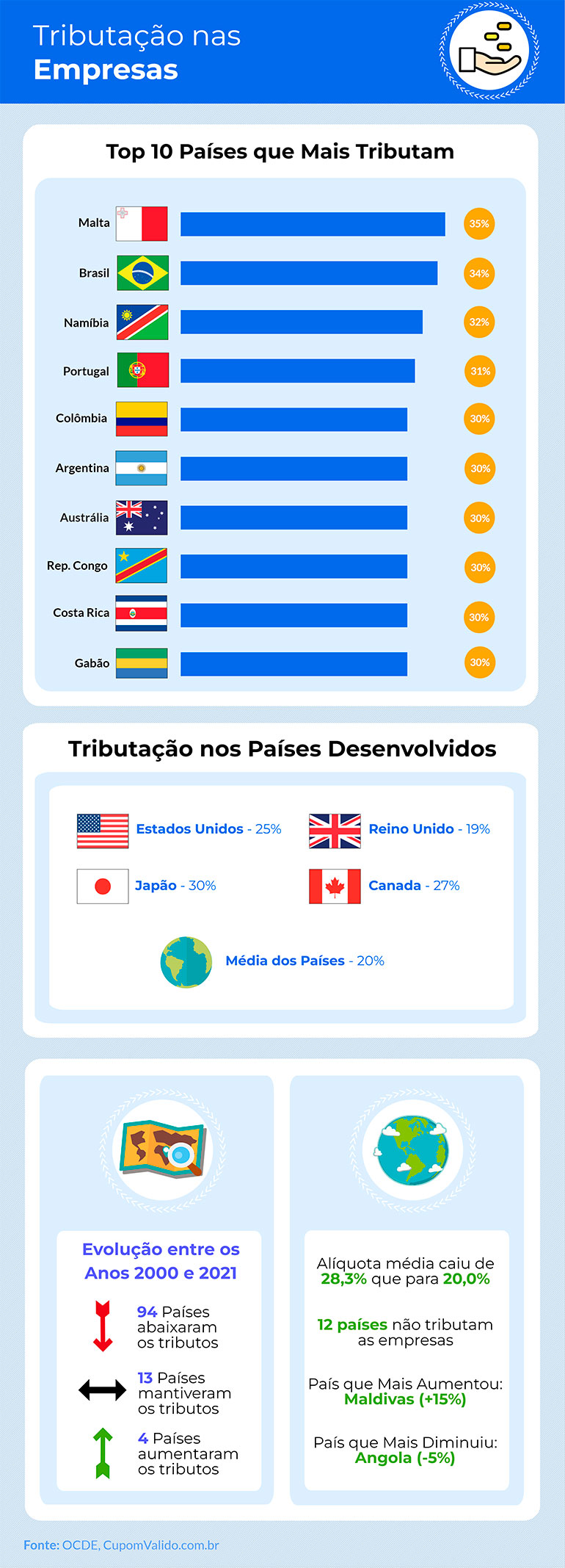 É o que revela um estudo divulgado pela plataforma CupomValido.com.br com dados da OCDE sobre a tributação das empresas.