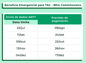 A primeira e a segunda parcelas do Benefício Emergencial aos Transportadores Autônomos de Carga - BEm Caminhoneiro, previsto na Emenda Constitucional nº 123, serão pagas no dia 9 de agosto, cada uma no valor de R$ 1 mil, referentes aos meses de julho e agosto. O Ministério do Trabalho e Previdência (MTP) é o órgão gestor do benefício.