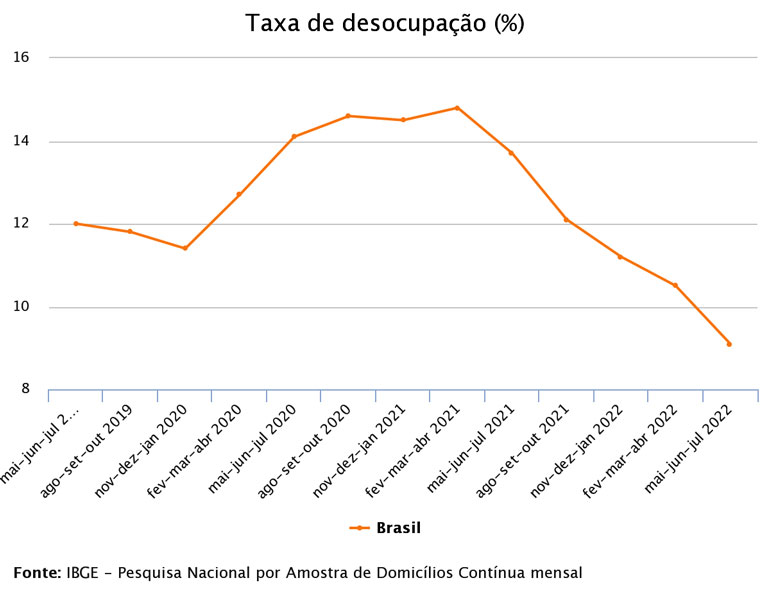 A taxa de desocupação, que mede o desemprego no país, caiu para 9,1% no trimestre encerrado em julho. Essa taxa representa uma queda de 1,4 ponto percentual na comparação com o trimestre anterior, terminado em abril. É o menor índice da série desde o trimestre encerrado em dezembro de 2015, quando também foi de 9,1%.