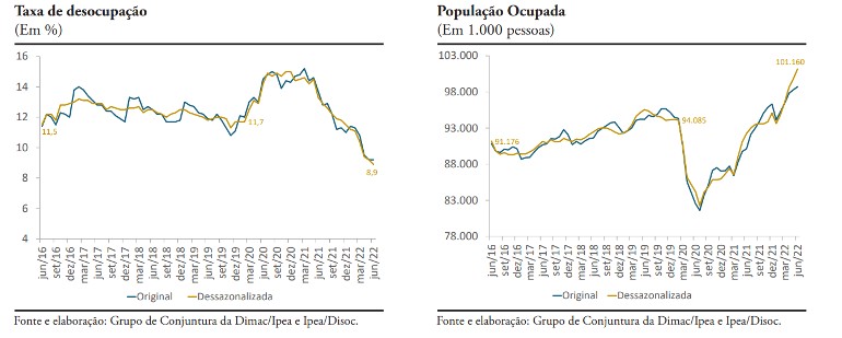 Em termos dessazonalizados, a taxa de desocupação recuou pela 13ª vez consecutiva, chegando a 8,9%, em junho de 2022 e atingindo o menor patamar desde julho de 2015.