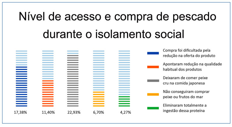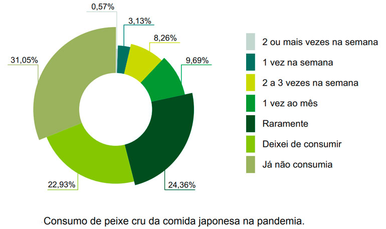 A pandemia chegou em um momento em que o consumo de pescado estava aquecido. O estudo revelou que 25,93% dos entrevistados consumiam pescado pelo menos uma vez na semana, 23,93% duas a três vezes no mês, 20,94% duas ou mais vezes na semana e 11,68% pelo menos uma vez no mês.