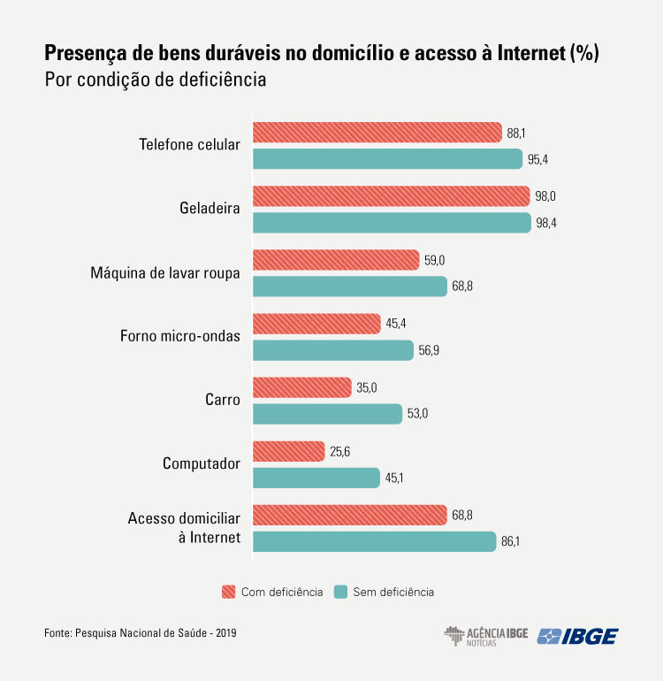 O saneamento básico e a internet no domicílio também foram abordados no estudo. Apenas 58,2% das pessoas com deficiência tinham acesso simultâneo a serviços de esgotamento sanitário por rede coletora, pluvial ou fossa ligada à rede, água por rede geral e coleta de lixo (seja direta ou indireta). Entre aqueles sem deficiência, esse percentual era de 62,4%. As pessoas com deficiência visual também apresentaram as menores proporções de acesso simultâneo a esses três serviços (46,7%).