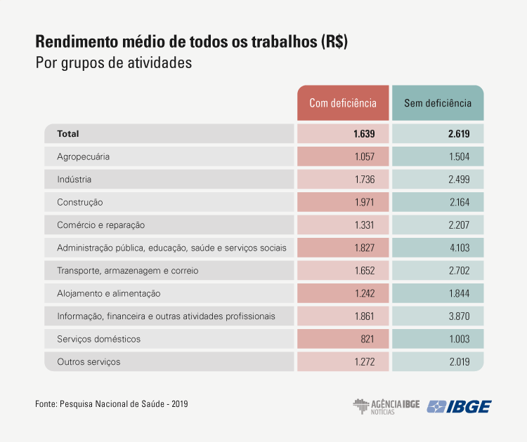 No caso da agropecuária, que empregava 14,4% das pessoas com deficiência ocupadas, o rendimento médio de todos os trabalhos desse grupo da população era de R$ 1.057, enquanto o de pessoas sem deficiência era de R$ 1.504. No comércio, que concentrava 17,1% das pessoas com deficiência, a disparidade era maior: elas recebiam, em média, cerca de 60% do valor pago aos trabalhadores sem deficiência.