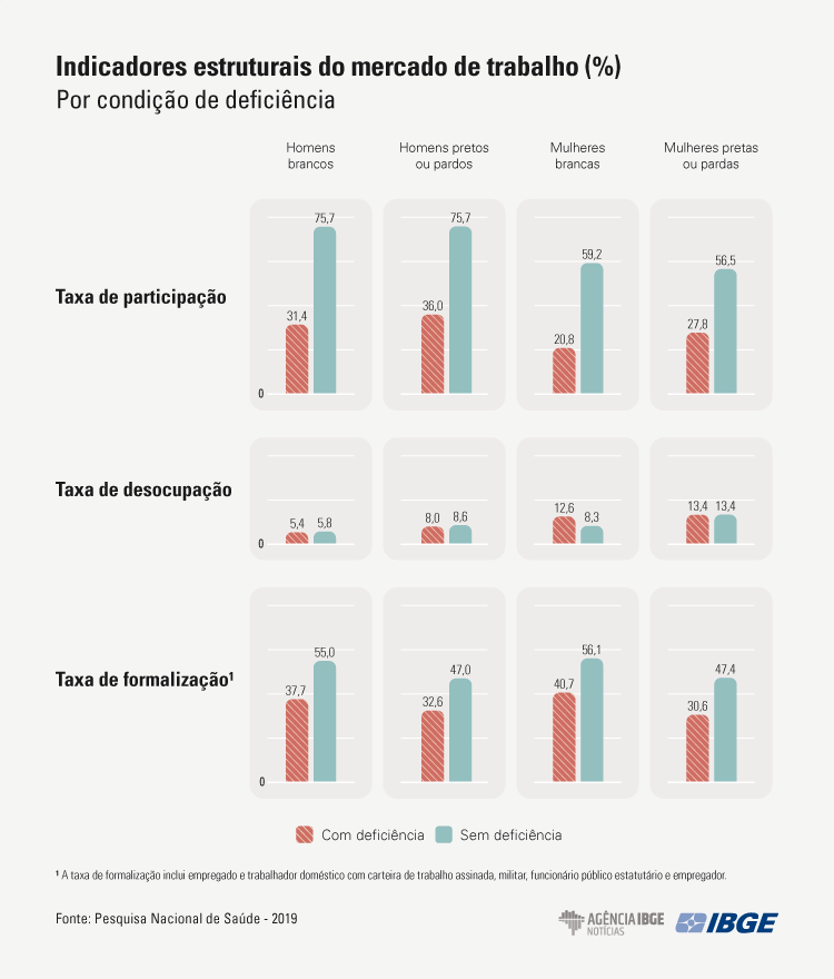 Os recortes de sexo e cor ou raça apontam para outras disparidades. A taxa de desocupação era de 12,6% entre as mulheres brancas com deficiência e de 8,3% entre as sem deficiência. Esse indicador era maior (13,4%) para as mulheres pardas ou pretas com ou sem deficiência.