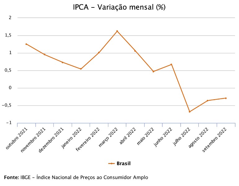 O Índice Nacional de Preços ao Consumidor Amplo (IPCA) de setembro foi de -0,29%, terceiro mês seguido de deflação. A queda foi menos intensa do que as registradas em julho (-0,68%) e agosto (-0,36%).