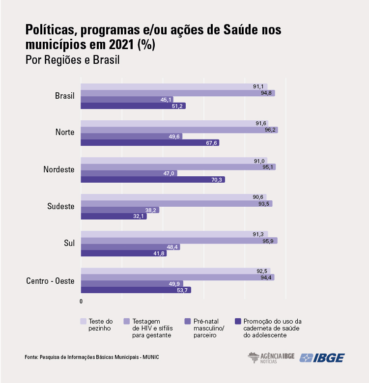 Dentro desse tema, a Munic avaliou a existência e a distribuição de algumas políticas, programas e/ou ações da área de saúde. Destaque foi para o teste de HIV e de sífilis em gestantes, presente em mais de 94,8% dos municípios. Já o teste do pezinho estava em 91,1% dos municípios enquanto o pré-natal masculino/do parceiro não alcançou metade, ficando em 45,1%.