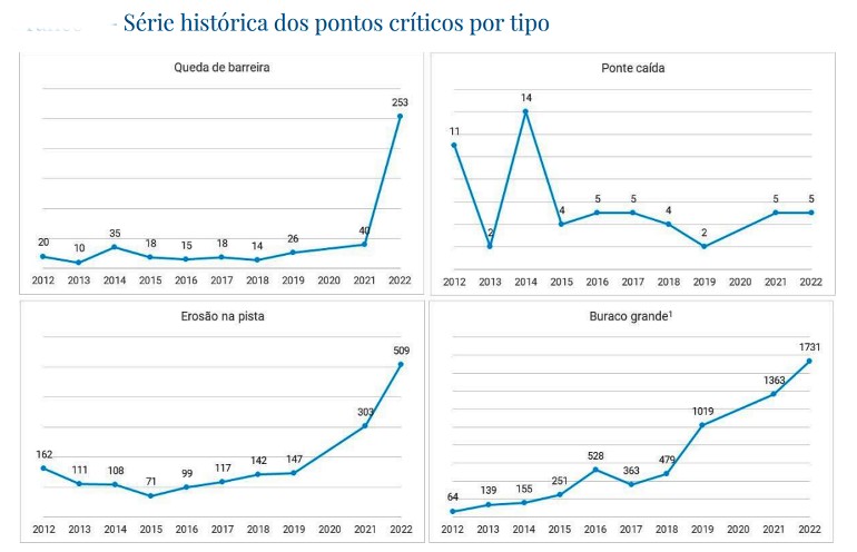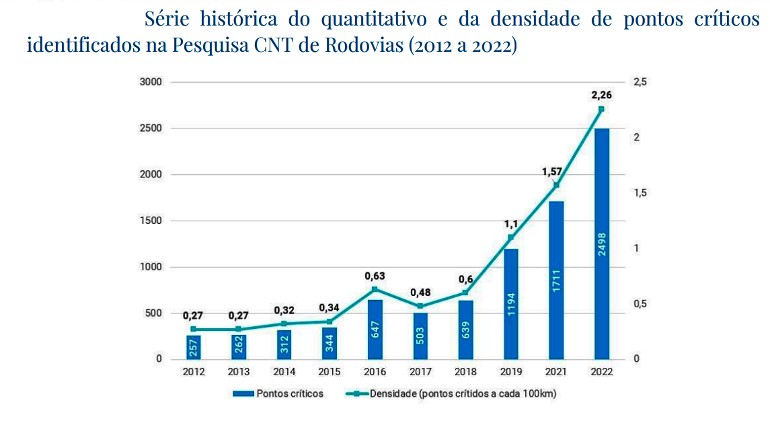 A série histórica apresentada nas publicações evidencia o panorama da degradação da malha rodoviária brasileira: em 2012, o usuário encontrava, em média, um ponto crítico a cada 372,4 quilômetros percorridos; em 2022, passou a se deparar com uma ocorrência a cada 44 quilômetros.