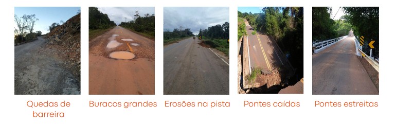 Esse quantitativo é 50% maior do que o identificado em 2021 (1.739 ocorrências). São 1.731 buracos grandes, 509 erosões na pista, 253 quedas de barreira, 5 pontes caídas, 76 pontes estreitas e 36 ocorrências do tipo “Outros” (tais como interdições da pista, obstáculos na via, pontes de madeira etc.).