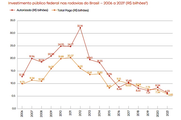 Para a resolução dos pontos críticos identificados em 2021, foi estimado o investimento de R? 1,81 bilhão, sendo a maior parte destinada às intervenções em segmentos com buracos grandes; já para solucionar o quantitativo de 2022, o montante aumentou para R? 5,24 bilhões, o que representa cerca de 28% de todo o recurso destinado ao então Ministério da Infraestrutura -- previsto na Lei Orçamentária Anual (LOA) 2023.