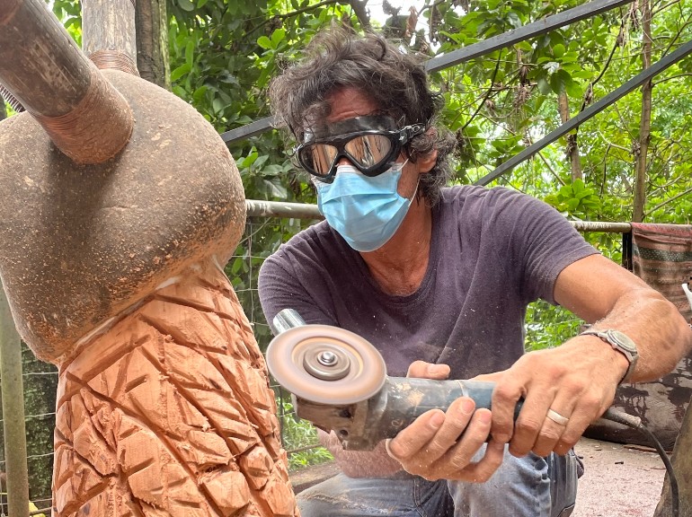 Reinstalado em Salvador desde de 2018, o artista carrega inquietações intelectuais que o conduzem entre o afeto pela geografia continental e a nostalgia de um destino. Suas investigações sobre o imaginário mitológico das matrizes indígenas se traduzem poeticamente em divindades pintadas em tela ou esculpidas em madeira, pedra e ferro.