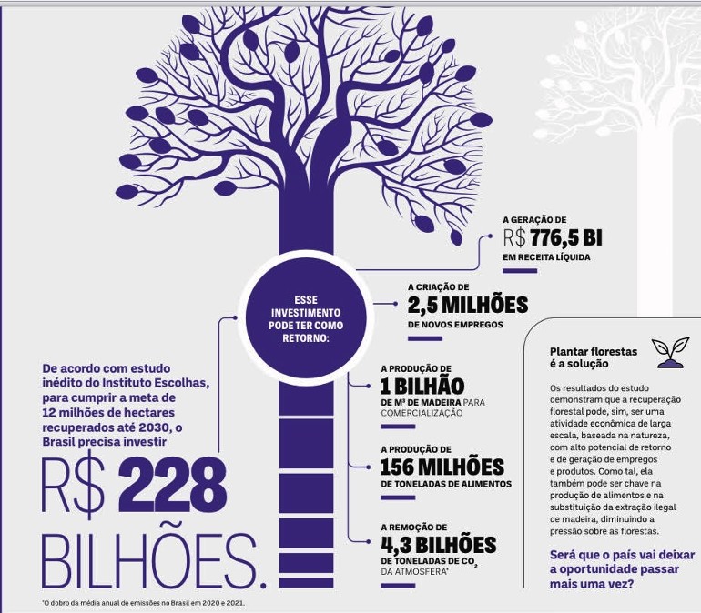 Para cumprir a meta assumida no Acordo de Paris (2015) de plantar 12 milhões de hectares de floresta até 2030, o Brasil precisa investir R$ 228 bilhões. A cifra é alta, mas seus desdobramentos positivos prometem ser ainda maiores.