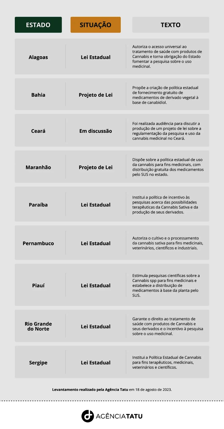 Segundo levantamento realizado pela Agência Tatu, entre as unidades federativas da região Nordeste, seis já aprovaram lei que regulamenta a cannabis medicinal em alguma dessas formas, dois estados possuem projeto de lei em tramitação e em apenas um não foi encontrada legislação ou projeto de lei sobre o assunto, mas já há discussão.