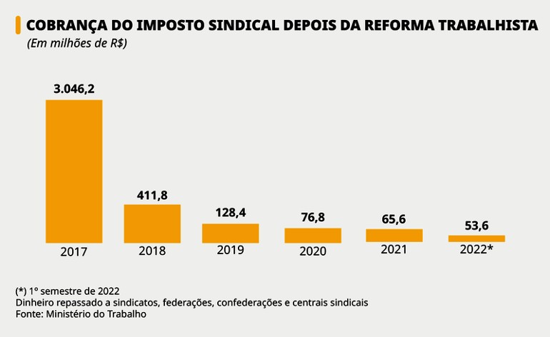 A cobrança da contribuição sindical obrigatória havia sido extinta através da reforma trabalhista do governo Michel Temer, em 2017. De lá para cá, ficou a critério do trabalhador a decisão de pagar ou não a taxa. Como a maioria dos empregados não procurou os sindicatos para fazer o pagamento, o dinheiro recebido através da contribuição anual caiu para aproximadamente R$ 65 milhões, em 2021. Ou seja: os sindicatos deixaram de receber mais de R$ 2,9 bilhões, por ano.