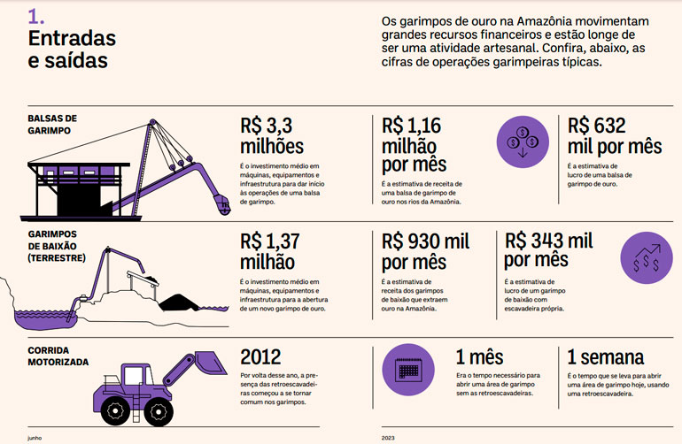 Qual é o custo de abrir um garimpo e qual o lucro das operações garimpeiras na Amazônia? Em seu estudo Abrindo o livro caixa do garimpo, o Instituto Escolhas mostra que o investimento para iniciar uma operação de garimpo de balsa na Amazônia ultrapassa 3 milhões de reais. Nos garimpos de baixão, o investimento inicial gira em torno de 1,3 milhão de reais. Números que provam o quanto a atividade garimpeira de hoje está muito distante da sua origem artesanal.