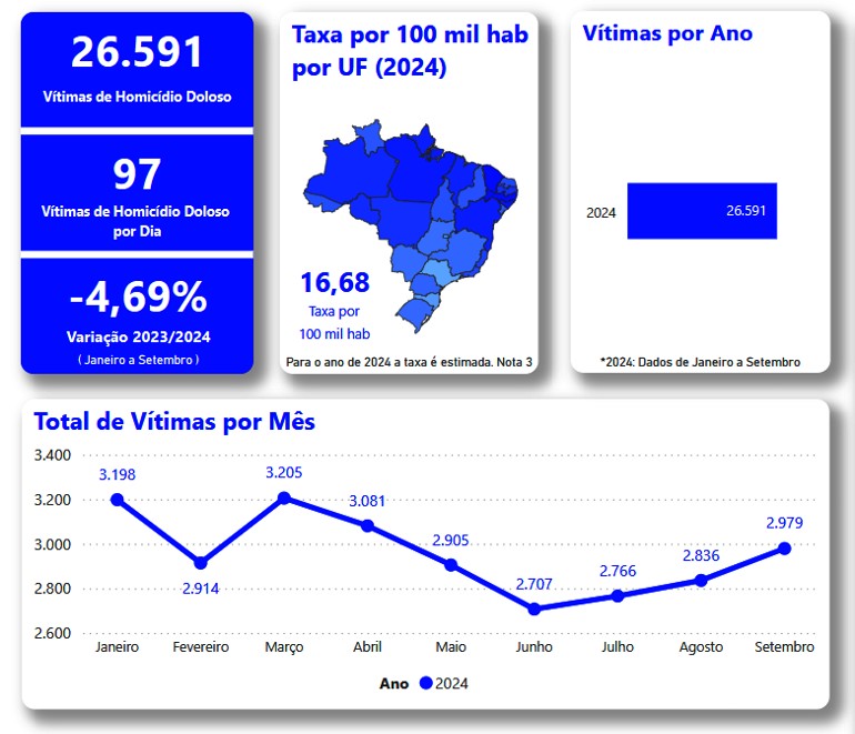 Em relação ao latrocínio – que é o roubo seguido de morte – o Brasil registou, em 2024, 673 casos, com uma média de duas vítimas por dia. Nesse tipo de crime, quem lidera o ranking é o estado de São Paulo, com 135 latrocínios ao longo do ano, com uma taxa de 0,39 casos a cada 100 mil habitantes.