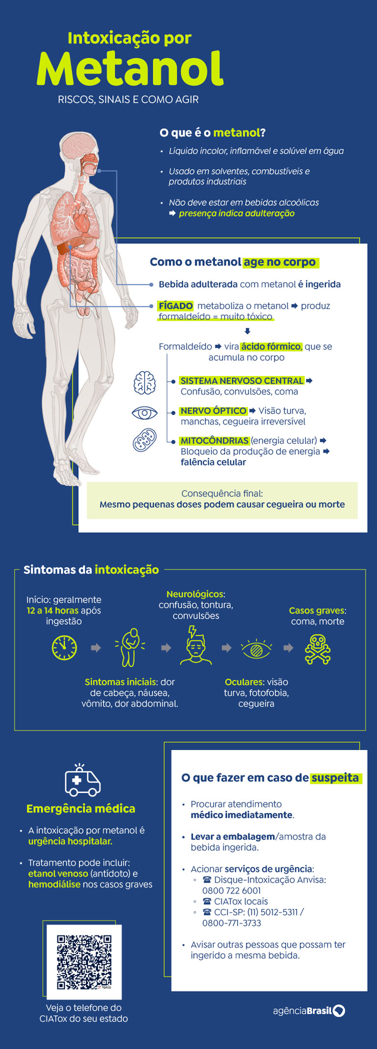 A intoxicação por metanol é uma emergência médica de extrema gravidade. A substância, quando ingerida, é metabolizada no organismo em produtos tóxicos (como formaldeído e ácido fórmico), que podem levar à morte.