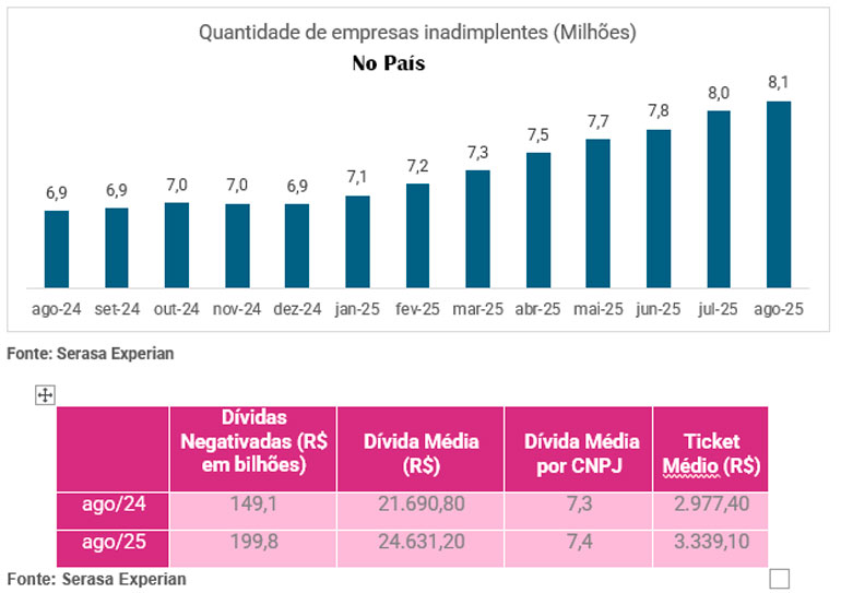O impacto também se reflete nas finanças dessas companhias: no período, a dívida média totalizou R$ 24.631,20, um aumento de 13,6% em relação a agosto de 2024.