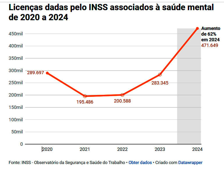 Só no ano passado, foram mais de 471 mil afastamentos associados a questões de saúde mental em todo o país. A Agência Tatu analisou os dados e identificou que os números superam, inclusive, o ano de início da pandemia da Covid-19, 2020, em que aconteceram 289.697 afastamentos, representando um crescimento de 62%.