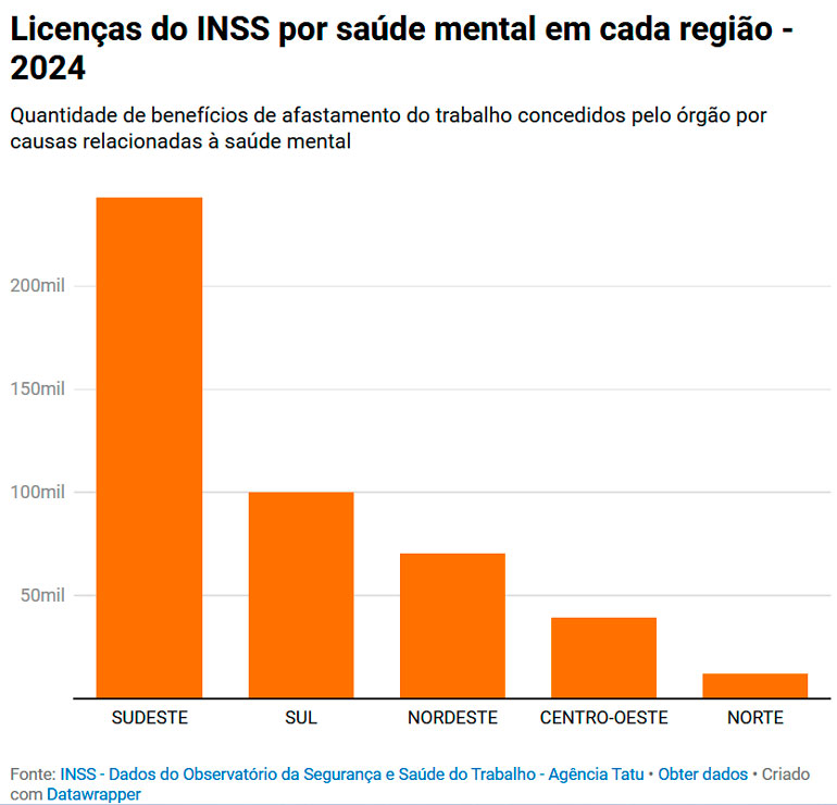 De todo o país, Santa Catarina foi o estado com maior número proporcional de afastamentos por saúde mental, concedidos pelo INSS em 2024 no Brasil, com 454 a cada 100 mil habitantes. Em seguida aparecem Distrito Federal (425), Rio Grande do Sul (358) e Minas Gerais (334).