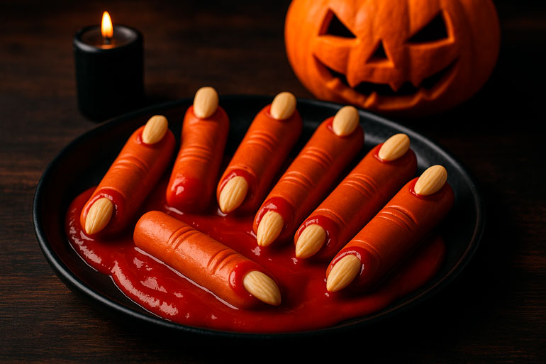 (Opcional) Enrole a salsicha em tirinhas de massa folhada para fazer “dedos mumificados”.