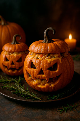 Dica final: Quer um visual mais sombrio? Sirva em um prato preto, com alecrim espalhado em volta — parece uma mini poção saindo da abóbora ??