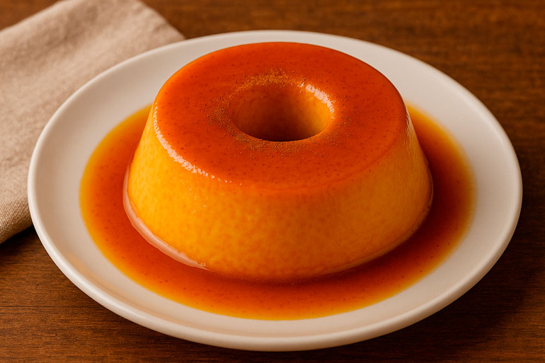 3 - Despeje o creme e leve ao forno médio, em banho-maria, por cerca de 35–40 minutos.