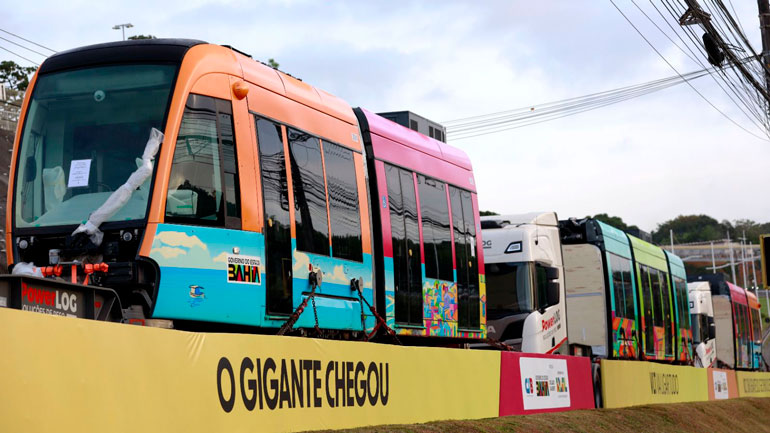 Os primeiros trens do Veículo Leve sobre Trilhos (VLT) foram oficialmente apresentados nesta quarta-feira (3) em Salvador, durante cerimônia conduzida pelo governador Jerônimo Rodrigues na Avenida Paralela. A composição, formada por sete módulos, chegou à cidade dois dias antes do previsto. O início dos testes técnicos está programado para o primeiro semestre de 2026.