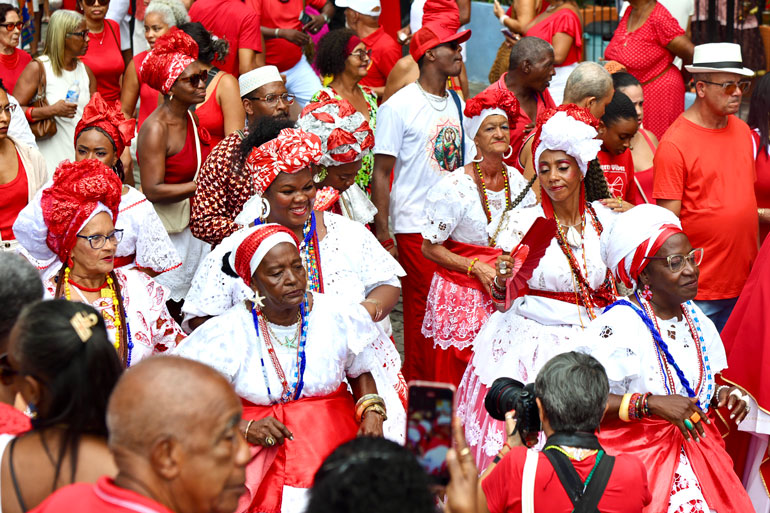 Após o encerramento das cerimônias religiosas, a festa ganhou ainda mais força nos quatro largos do Pelourinho, onde nove atrações musicais deram continuidade às homenagens. Ao longo da tarde, rodas de samba, grupos tradicionais e artistas da cena afro-baiana movimentaram o Centro Histórico, unindo fé, música e ancestralidade e celebrando Santa Bárbara com alegria, devoção e resistência cultural.