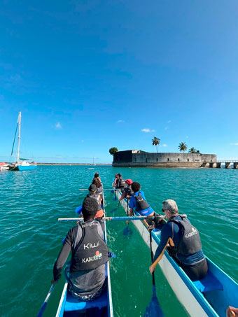 O Kaiaulu instalou um flutuador próximo ao Forte São Marcelo. O equipamento serve como ponto de apoio para pausas, mergulhos e fotos com vista para a cidade, intensificando a conexão dos remadores com o mar e o ambiente urbano de Salvador.