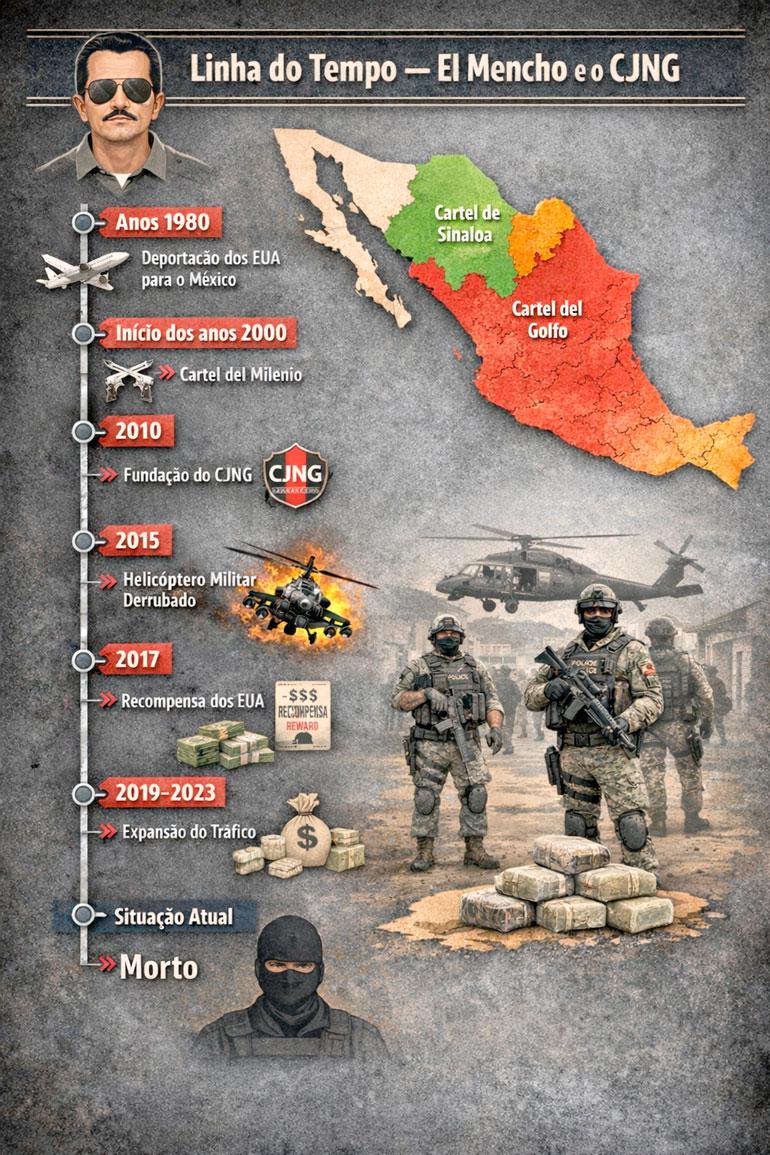 Cidade do México -- Forças federais mexicanas mataram o chefe do poderoso cartel de drogas Jalisco Nueva Generación (CJNG), Nemesio Rubén Oseguera Cervantes, conhecido mundialmente como El Mencho, durante uma operação de segurança no município de Tapalpa, no estado de Jalisco, no oeste do México, nesse domingo (22 de fevereiro).