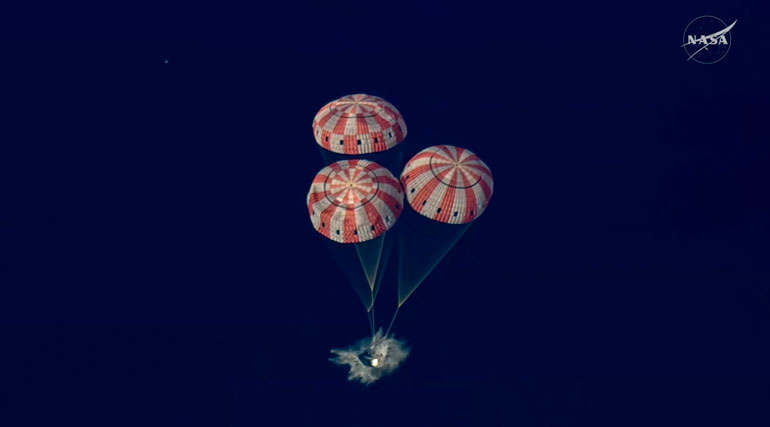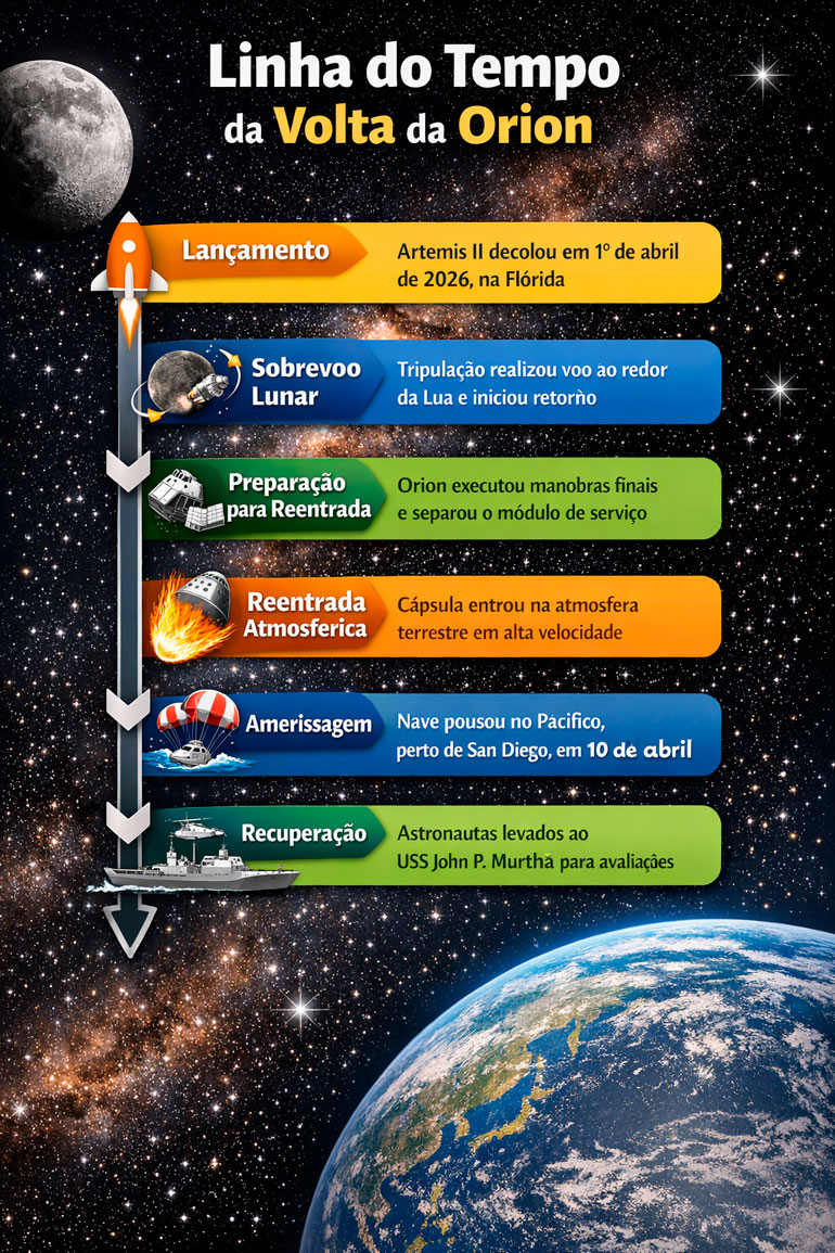 A nave Orion pousou com sucesso no Oceano Pacífico, na costa de San Diego, na Califórnia, na noite de 10 de abril de 2026, encerrando a missão Artemis II, o primeiro voo tripulado do programa Artemis e a primeira viagem humana ao redor da Lua em mais de meio século. Segundo a NASA, a amerissagem ocorreu após a reentrada atmosférica e a abertura dos paraquedas principais, concluindo uma jornada de cerca de 694.481 milhas.