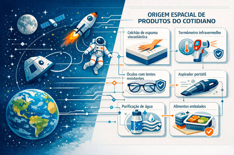 Muita gente associa o programa espacial a foguetes, astronautas e imagens da Lua. Mas uma parte importante dessa história está bem mais perto do chão. Ela está no colchão, no óculos, no termômetro, no aspirador portátil e até em práticas que ajudam a deixar os alimentos mais seguros.