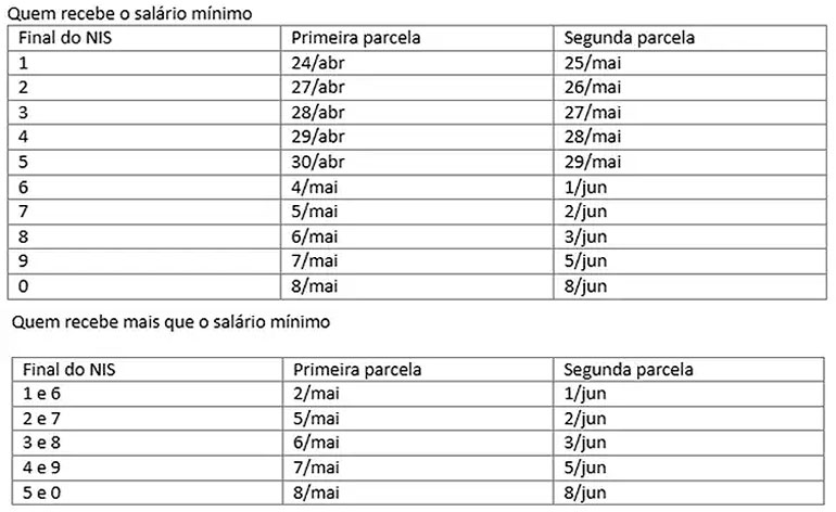 As datas são definidas com base no dígito final do Número de Inscrição Social (NIS) e com base na renda do beneficiário. Quem ganha apenas o salário mínimo começa a receber antes de quem recebe mais que o mínimo.