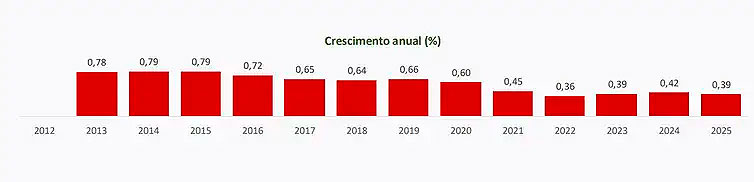 A taxa anual de crescimento da população brasileira permanece abaixo de 0,60% desde 2021. Em 2025, as mulheres representavam 51,2% dos moradores do país, enquanto os homens somavam 48,8%.