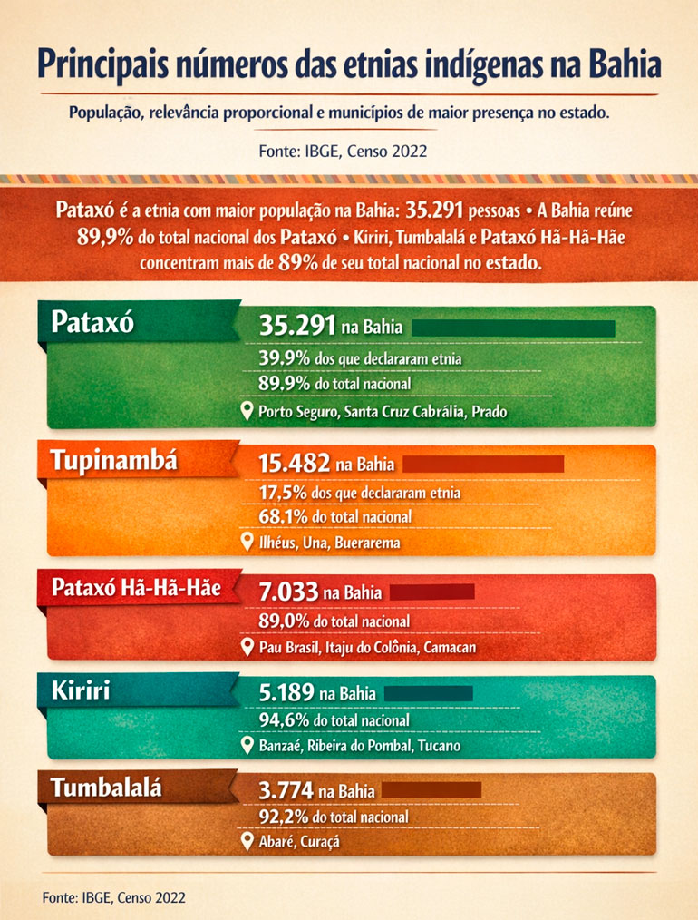 Os números mostram que o estado concentra as maiores populações brasileiras de etnias como Pataxó, Tupinambá, Pataxó Hã-Hã-Hãe, Kiriri e Tumbalalá. A distribuição dessas populações pelo território baiano também revela forte presença indígena em dezenas de municípios, com destaque para o sul, o extremo sul e o norte do estado.