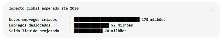 O Fórum Econômico Mundial projeta que a transformação do trabalho afetará 22% dos empregos atuais até 2030, com criação de 170 milhões de novas funções e deslocamento de 92 milhões. O saldo líquido estimado é de 78 milhões de vagas.