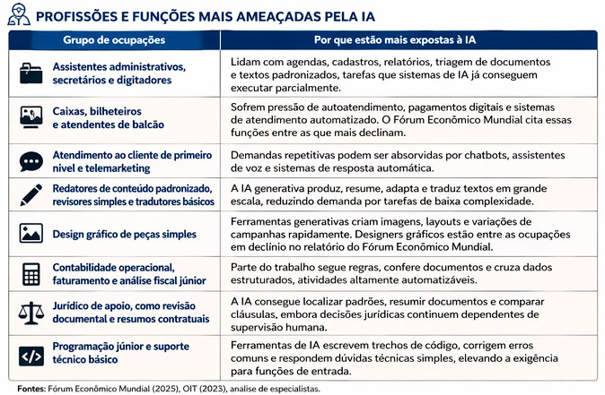 As funções mais expostas são aquelas baseadas em tarefas repetitivas, digitais, padronizadas e dependentes de texto, dados, atendimento ou produção de conteúdo simples.