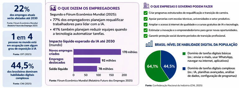 O mesmo relatório afirma que quase 40% das habilidades exigidas no trabalho devem mudar e que 63% dos empregadores veem a falta de qualificação como a principal barreira para transformar seus negócios. Isso indica que a disputa central dos próximos anos será por adaptação, treinamento e capacidade de usar a IA de forma produtiva.