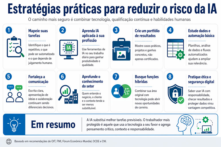 A melhor resposta individual ao risco não é negar a IA, mas aprender a usá-la de forma crítica. Trabalhadores devem começar pelo mapeamento das próprias tarefas: quais atividades do cargo são repetitivas, quais dependem de julgamento humano, quais podem ser aceleradas por IA e quais exigem responsabilidade direta.